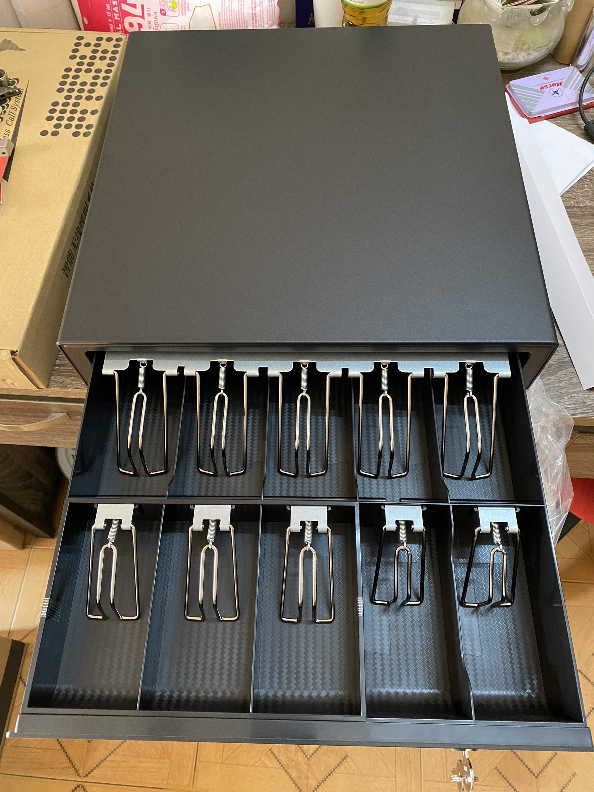 10 ngăn đựng tiền, có 10 thanh sắt kẹp, 10 ô lớn Kích thước: 453 (W) x 441 (L) x 136 (H) (mm)